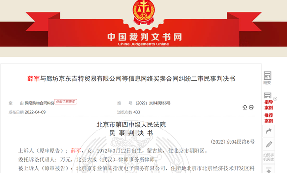 投诉未果,薛军转而寻求法律帮助,一纸诉状将京东叁佰陆拾度公司和廊坊京东吉特贸易有限公司告上法庭。据了解,京东叁佰陆拾度公司为京东方的销售平台,而廊坊京东吉特贸易有限公司则是提供产品货源并进行销售的经销商。