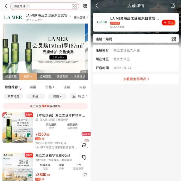 同时,在京东平台搜索“海蓝之谜”,在售卖其产品的也只有LAMER海蓝之谜京东自营官方旗舰店,未见其他店铺出现在列表。据悉,海蓝之谜(LAMER)品牌官方于今年1月24日才入驻京东平台。