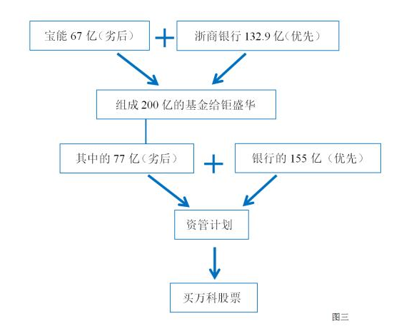另一方面,银行理财资金成立投资公司间接增持万科。2015年11月,宝能出资67亿元作为劣后,浙商银行132.9亿元作为优先,通过华福证券、浙商宝能资本构建有限合伙基金,规模最终达200亿元。这笔资金通过增资、股东借款等形式进入钜盛华。此后,钜盛华用其中的约77亿元作为劣后,广发、平安、民生、浦发等银行出资155亿元作为优先,共计约233亿元,通过证券公司和基金公司资产管理计划,继续增持万科。