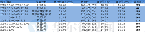 这九个资管计划分别是安盛1号、安盛2号、安盛3号、广钜1号、广钜2号、泰信1号、西部利得金裕1号、西部利得宝䘵1号和东兴7号。