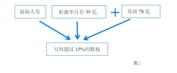 据新华社,第二阶段钜盛华以自有资金约39亿元,以1:2的杠杆撬动券商资金约78亿元,购买万科股票。这期间的杠杆主要是通过与中信、国信、银河等券商开展融资融券和收益互换实现的。至此,前海人寿和钜盛华持股万科比例合计超过15%。