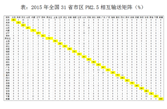 7月8日,环保部环境规划院发布2015年度全国PM2.5跨省输送矩阵(以下简称矩阵),除新疆不存在PM2.5跨省输送外,其他省份都存在一定的输送比例。