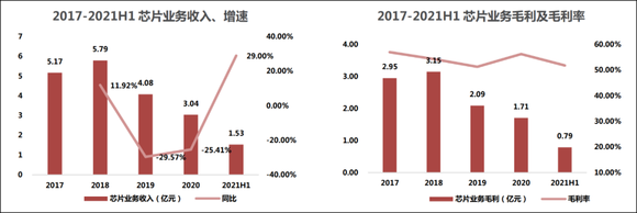 在没有缺芯这个事情的时候,四维图片的芯片业务表现不及预期。2017年收购杰发科技,2018年收入增长仅12%,随后收入和毛利开始大幅下滑。当初收购时承诺2016-2018年累计净利润7.18亿元,最终三年仅累计实现业绩承诺的84.11%(对赌期结束后的2019年,杰发科技的净利润更是大幅下滑,2020上半年更是直接来到了可怜的18.06万)。