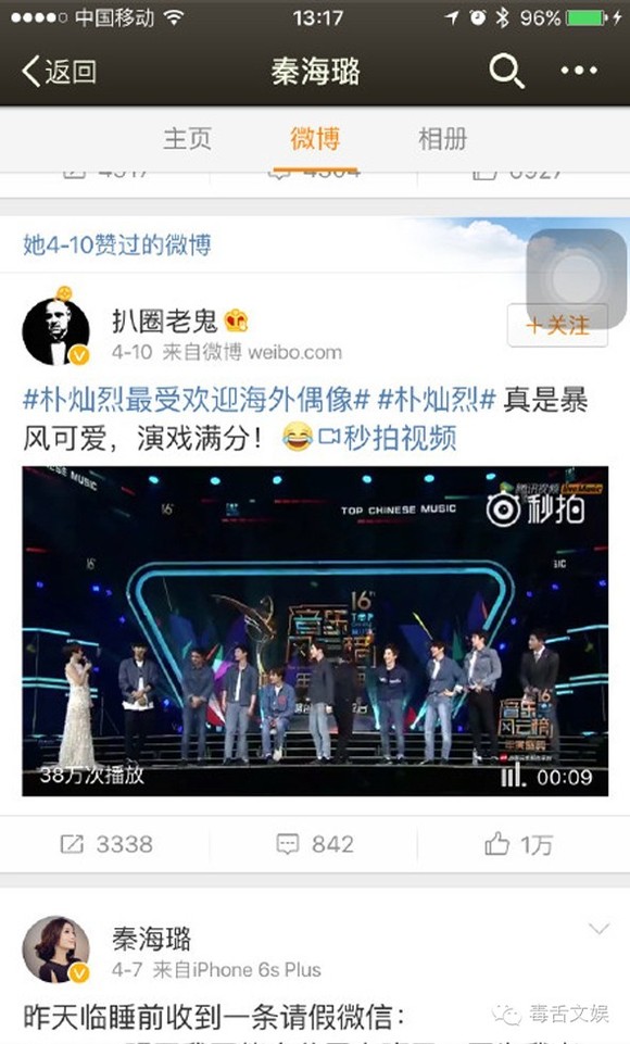 不仅会点赞夸灿烈的微博,还会发关于灿烈的微博。