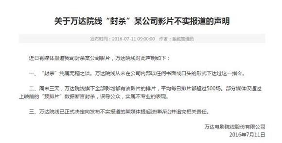 万达否认封杀某公司影片:误导公众不专业