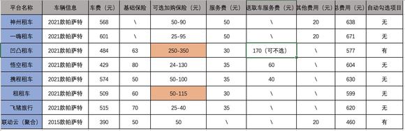 以一台车龄两年内的大众帕萨特为例,租赁日期是2022年4月30日,WEMONEY研究室统计了八家租赁平台的情况。从表格可以看出一嗨的整体价格最高,所有平台会收取相应的手续费和基础保险费用,此外平台一般会配置可选的加购保险,价格从50-300元不等。神州和一嗨有自营店,用户一般就近门店取车,没有送取车费。悟空、凹凸、携程有送取车费,凹凸租车的送取车费价格是其他两家平台的二倍。凹凸虽然可选自行取车,但送取车费一般是自动配置用户稍不注意就会被“加购”。此外,凹凸和联动云在订车页面还会自动勾选额外保险,凹凸的额外加收的保险费用可高达数百元。