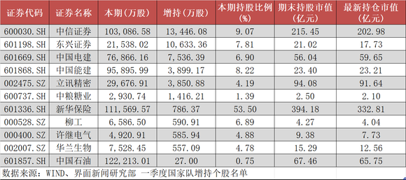增持方面,一季度,国家队增持了11只个股,增持数量超1000万股的有6只,分别为中信证券(增持1.34亿股)、东兴证券(增持1.06亿股)、中国电建(增持7536.39万股)、中国能建(增持3899.17万股)、立讯精密(增持3850.88万股)、中粮糖业(增持1416.21万股)。