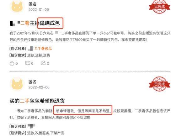 在相关投诉平台,依然有消费者反映,自己在直播间购买的二奢商品,被主播“隐瞒成色”、“申请退款被拒”等。