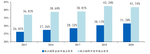 根据中国乐器协会的数据显示,我国钢琴市场还是以低端入门级钢琴为主,比如国产的珠江钢琴,2020年在国际市场上有着31.3%的市场份额,在国内还有海伦钢琴等其他知名品牌,如果两个品牌合并市场份额将逼近50%,成为钢琴市场最大的主力军。