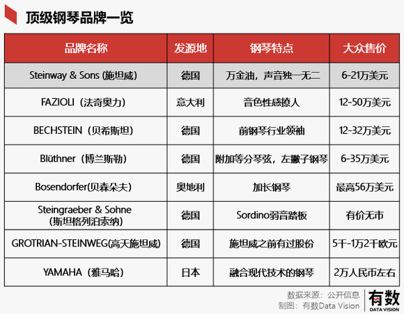 入门级钢琴集中度极高,而高级钢琴却是竞争激烈。不仅牌子多,而且发源地集中,都在欧洲——毕竟人家发明了古典音乐嘛。