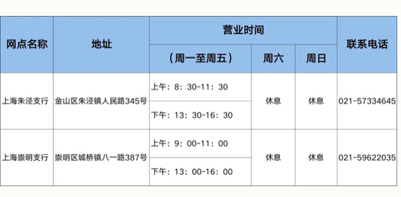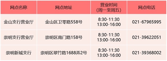 其中,工商银行首批恢复营业的网点为金山支行营业厅、崇明支行营业厅、崇明新城支行,中国银行恢复的营业网点为金山枫泾支行和崇明支行,建设银行上海分行恢复的营业网点为上海朱泾支行和上海崇明支行,交通银行恢复的营业网点为金山支行营业部,邮储银行恢复营业网点为金山万达广场支行和崇明区支行营业部。