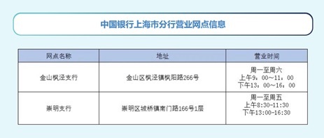 中行上海市分行首批恢复营业网点信息