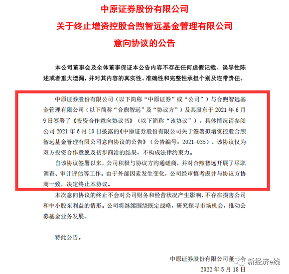 5月18日,中原证券发布关于终止增资控股合煦智远基金管理有限公司意向协议的公告称,公司与合煦智远基金及其股东于2021年6月9日签署了《投资合作意向协议书》。该协议仅为双方投资合作意愿及初步商洽的结果,不构成法律约束力。
