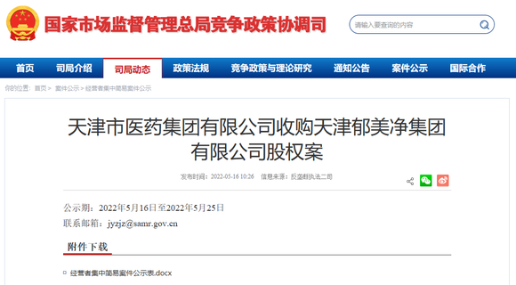 5月16日,国家市场监管总局反垄断局网站公示天津市医药集团有限公司(下称“天津医药”)收购天津郁美净集团有限公司(下称“郁美净”)股权案,公示期为2022年5月16日至2022年5月25日。