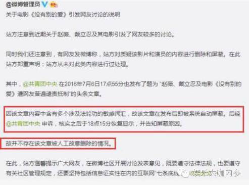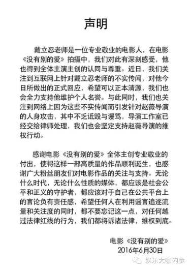 在这种情况下,6月30日《没有别的爱》出了一个官方声明,称网上针对戴立忍的消息为不实新闻: