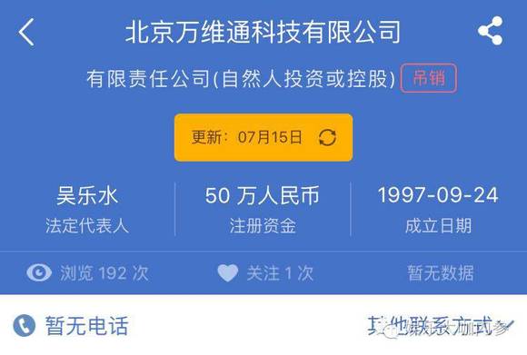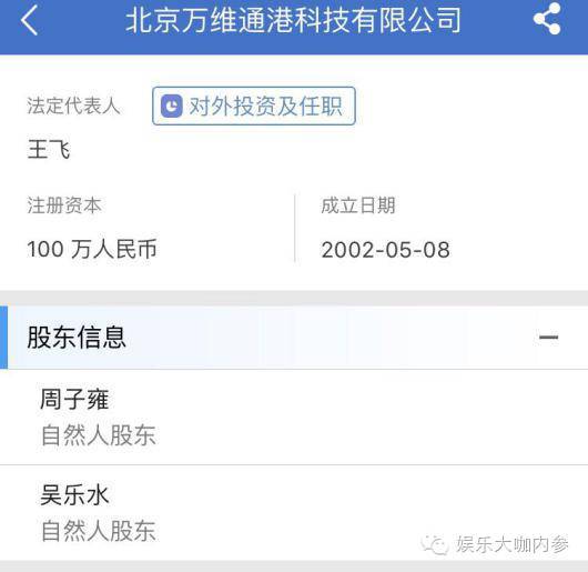 娱乐大咖内参(微信公众号ID:yulebiggie)查到,虽然这个公司倒闭了。但2002年5月“北京万维通港科技有限公司”成立,法人代表为王飞,股东为周子雍和吴乐水。这家公司2015年还公示了年报,根据其年报信息显示该公司旗下拥有“你好万维网nihao.net”的域名。