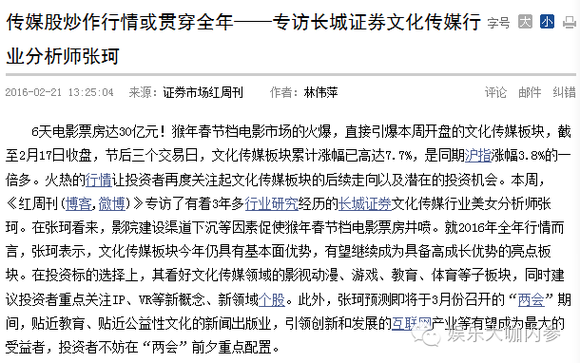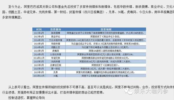 首先,马云旗下的阿里巴巴的确近两年在文化传媒行业跑马圈地(其实阿里系在很多领域都凶猛扩张),除了在一定程度掌握话语权外,还有一个根本原因是文化传媒是目前大热行业,资本都是逐利的,哪个行业热投哪里,能获得回报还能炒高股价有何不可?