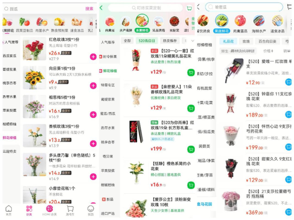 在鲜花日常化的趋势之下,叮咚买菜、盒马鲜生和每日优鲜等生鲜平台,抖音和快手直播间,以及淘宝、拼多多等电商平台纷纷布局鲜花业务。