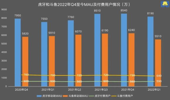 两家平台都为流量而焦虑着,虎牙和斗鱼的MAU增长率几乎持平,并在2021年Q4开始下滑。