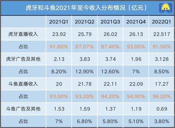 根据财报数据,依靠版权吸引来的流量,让虎牙的广告收入占比在2021年Q2和Q3短暂地超过10%,但这样的增长并不解渴,随着游戏版号收紧,这部分收入也随即减少,近两个季度,直播收入再次占到91%以上。而斗鱼的直播收入占比,一直高于93%,占比最高达到过96%。
