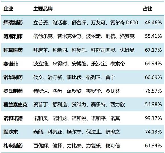 在华十大外资药企前五大药品品牌及其销售规模占比
