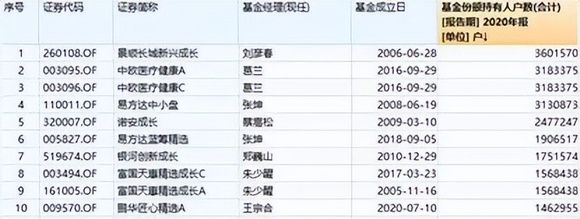 ▲在2020年底,以基金份额持有人户数来看,国内前十名明星基金经理旗舰产品均拥有超百万粉丝。数据来源:Wind