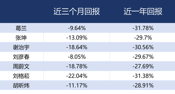 而从短期收益看,管理规模超过500亿元的7位基金经理的收益全部为负,他们分别是葛兰、张坤、谢治宇、刘彦春、周蔚文、刘格菘、胡昕炜。