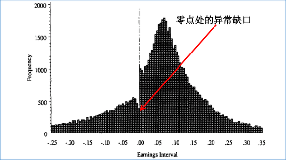 学者研究发现,如果画一张所有的美国上市公司利润分布图,横轴是每股利润,纵轴是每一个利润区间的公司数目,会发现这张图违背了正态分布:在零点左右有一个异常的缺口。在零点的左边,也就是说在亏损的地方,公司的数量异常少,而在极小盈利这块异常多。