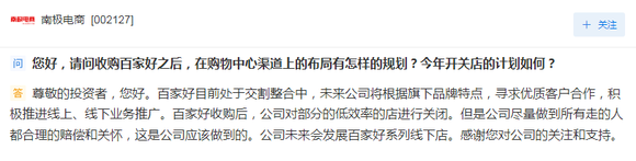 5月27日,在投资者互动平台上,有投资者发问:“收购百家好之后,在购物中心渠道上的布局有怎样的规划?今年开关店的计划如何?”南极电商给出的有效回复是,“百家好目前处于交割整合中,未来公司将根据旗下品牌特点,寻求优质客户合作,积极推进线上、线下业务推广。百家好收购后,公司对部分的低效率的店进行关闭。但是公司尽量做到所有走的人都合理的赔偿和关怀,这是公司应该做到的。公司未来会发展百家好系列线下店。”