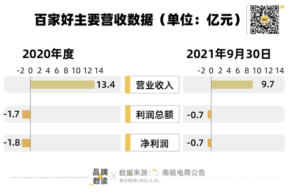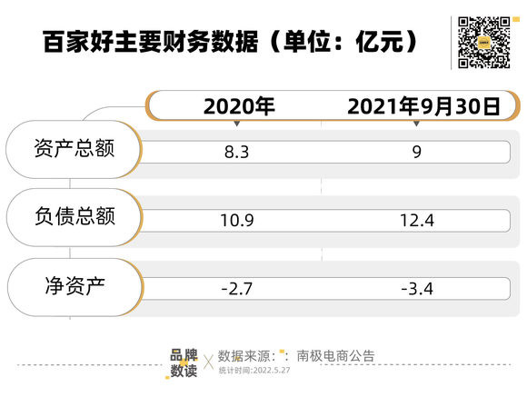 南极电商公布的数据显示,在2020年,百家好资产总额8.3亿元,负债总额高达10.9亿元,当年营收13.4个亿,却亏损1.8个亿。到了2021年被收购时,净资产亏损扩大至3.4亿元,相当于南极电商2021年营收的十分之一。