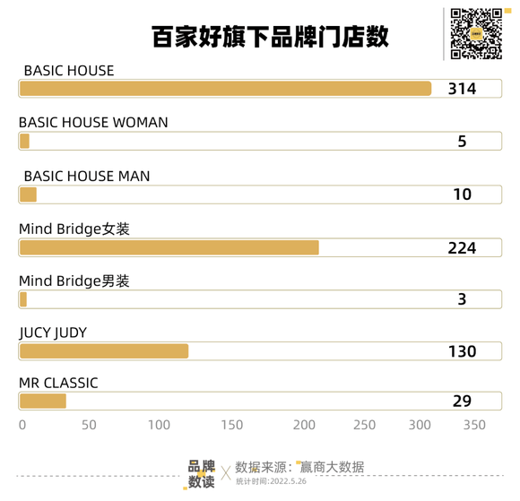 公开资料显示,百家好成立于1996年,BASIC HOUSE 在2000 年进入中国,Mind Bridge和JUCY JUDY在2003年进入中国,三个品牌分别主打潮流时尚、商务休闲和少女风格,凑齐了多样化的品牌矩阵。