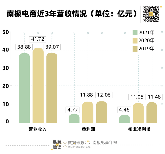 随着品牌力不断被消耗,南极电商的营收也开始下滑。2021年,南极电商营业收入总计完成38.88亿元,同比下降6.80%。其中,公司本部营业收入总计完成8.08亿元,同比下降42.12%。归属于上市公司股东的净利润为4.77亿元,同比下降59.84%。