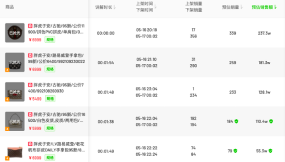 通过某数据平台,我们看到子安直播间5月16日数据,销售额排名前五的是5款包。一个细节是,既然是奢侈品,为什么每款包会有几十甚至几百个销量。这种情况,除了是假货的可能,就是和上述1元福利包一样的套路,刷量了。