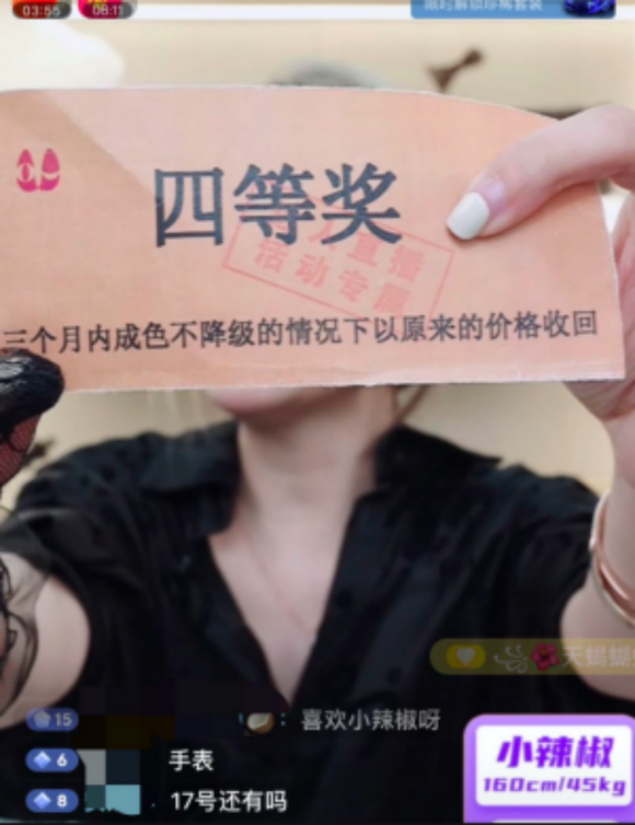 作为一位二奢头部主播,子安直播间抽奖套路还不止这一种。5月19日,子安直播间是主播小辣椒在直播。他们推出了另一种抽奖活动,凡是下单买包的用户,均可参与抽奖,一等奖奖励1万元;二等奖是胖虎五折券,限额一万元,所拍包款只要确认收获退一半;三等奖送银色猫头或爱马仕五件套;四等奖是,在三个月内成色不降级的情况下,以原来的价格收回。