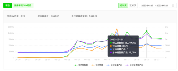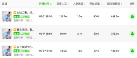 统计时间段内,胡兵对应有6场直播记录。在5月7日、5月14日和5月21日销售额较高,分别为498.5万、355.9万、426.6万。胡兵直播销售额对行业直播数据,有直观影响,近段时间出现的峰值中,尤其是5月21日这场直播数据,造就了行业同日的峰值。