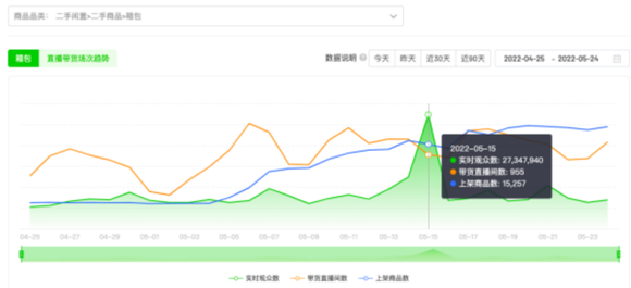 二奢遇冷,已是不争的事实。新腕通过某数据平台看到,在最近30天内,二手闲置箱包类目直播带货情况萎靡不振,直播间观看人数在5月15日达到峰值,为2734.8万人次。据查询,彩虹夫妇(平台将其划分在二手闲置箱包范畴)当日直播13个多小时,最终完成过亿GMV,是该类目当日关注数高的一项原因。