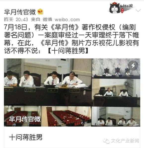 7月18日,《芈月传》小说作者蒋胜男起诉电视剧《芈月传》著作权侵权(编剧署名问题)一案开庭。昨晚,“芈月传官微”发表长微博,十问蒋胜男,质疑其看不懂合同等,还指出蒋所写“剧本”不达标,修改多次仍然收效甚微。