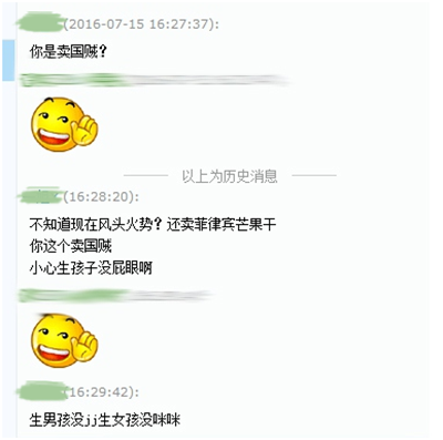 不过坏消息是,随着移动互联网、尤其是微信的普及,“爱国群体”有了更庞大的群众基础。每一天都有成千上万条“抵制肯德基、麦当劳”,抵制“iPhone7”、抵制“菲律宾芒果干”的消息出现在朋友圈,并伴随着“不转不是中国人”、“不转穷一年”、“不转家人XXX”的口号,被送达至以亿为单位的受众。