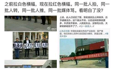 前天(7月18日)起,全国多地的“爱国人士”发起了打横幅、围堵肯德基活动,呼吁拒绝美国品牌,抵制美日韩菲。