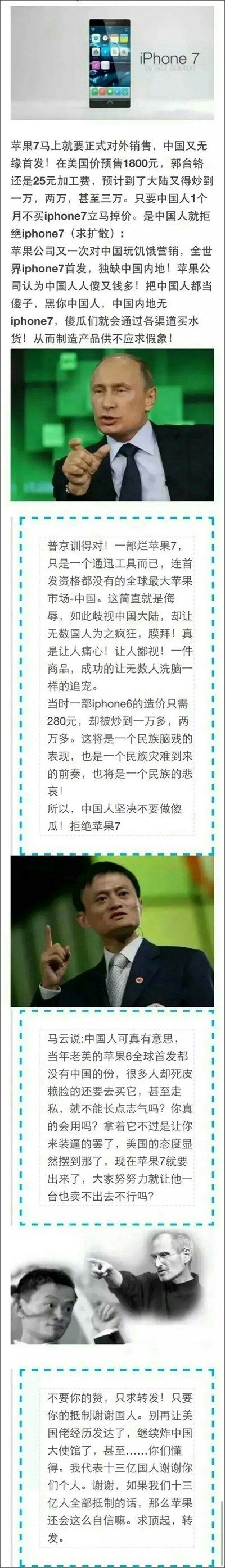 因此,传播奇葩言论、谣言并不是小事情,转发某些“爱国言论”不仅不爱国,还会被归纳为不智的群体。转发前花一些时间了解真实情况,才是理智者该有的态度。比如,马云也是用iPhone的,从4S一直批判到iPhone7,他和普京已经很累了,让他们歇歇吧。