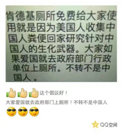 他们中的一些已经付诸行动,朋友圈的口号是其行动标语——“你吃的是美国肯德基,丢的是咱老祖宗的脸”。