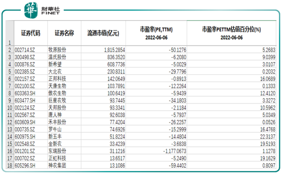 按以上行业分类,畜禽饲料+生猪养殖共17只个股,流通市值在百亿元规模以上的有7只个股,其中牧原股份的流通市值最高,约1800亿元。而排名第二的温氏股份的流通市值才800亿附近。