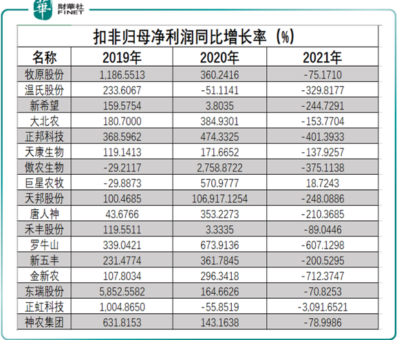 从2021年的扣非净利润同比增长情况看,只有巨星农牧是正增长(18.72%),其余个股的该项指标皆为负值。