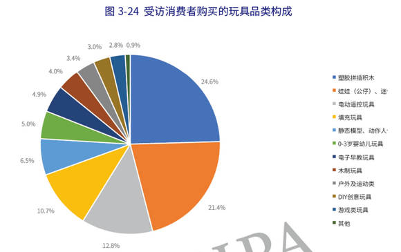 受访消费者购买塑料拼插积木的占比最高,为24.6%;其次是娃娃(公仔)和迷你玩偶类,占比21.4%;再次为电动遥控玩具,占比12.8%。