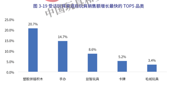 积木品类不仅销售额占比高,销售增长也快。20.7%的受访玩具渠道商表示塑胶拼插积木是其销售额增长最快的品类,其次为手办(14.7%)、益智玩具(8.6%)、卡牌(5.2%)和毛绒玩具(3.4%)。