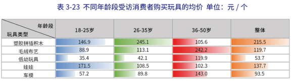 其中,26-35岁年龄受访消费者购买的玩具中塑胶拼插积木的均价最高,为245.1元/个;36-50岁年龄受访消费者购买的玩具中毛绒布艺类的均价最高,为242.2元/个。