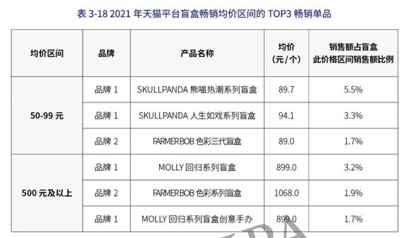在50-99元和500元及以上价位,盲盒的畅销产品都集中在 TOP5品牌。