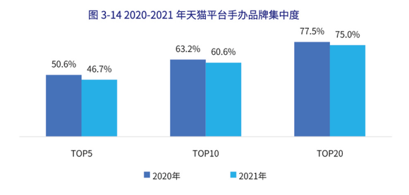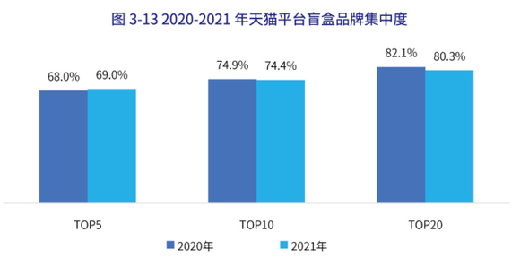 从销售额看,盲盒TOP5品牌集中度为69.0%,比上年再提高1%;TOP10品牌集中度为74.4%,TOP20品牌集中度为80.3%,都有所下降。