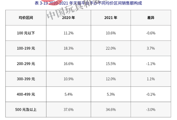 2021年,天猫平台的车模类玩具销售额同比增长10.8%,销量同比增长13.5%,销售均价同比下降2.3%。