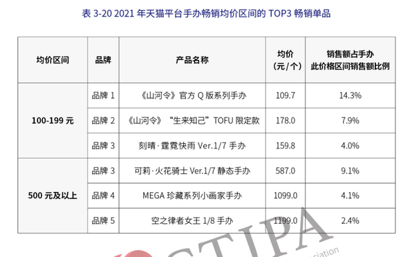在销售额占比较高的500元及以上、100-199元价位,畅销单品以游戏及动漫周边手办为主。